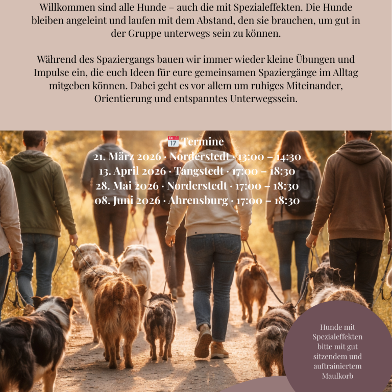 Der Sozialspaziergang bietet dir und deinem Hund die Möglichkeit, in Anwesenheit anderer Hunde und Menschen ruhig mitzulaufen und Alltagssituationen gelassen zu erleben. Die Hunde bleiben an der Leine, und es wird auf ausreichend Abstand und Rücksichtnahme geachtet, damit kein Hund überfordert wird.